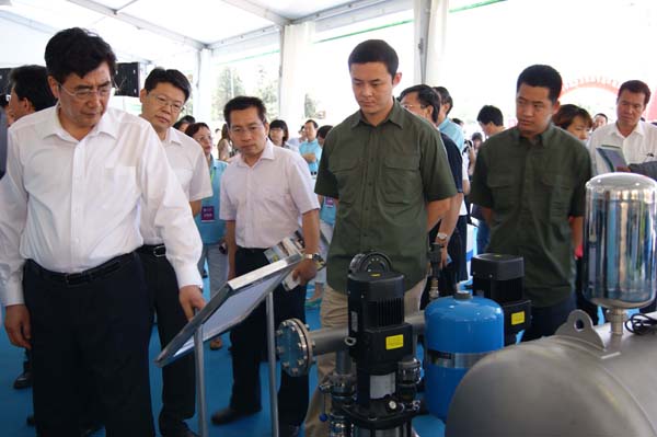由國家發改委、節能中心、北京市政府聯合舉辦的中國北京國際節能展于2012/06/10 在京舉行,熊貓集團作為國內唯一一家供水設備制造商受邀參展。作為展會節能重點企業,北京市長郭金龍等領導到熊貓產品展示臺前仔細詢問企業發展和產品節能 情況,并在展臺前留影。